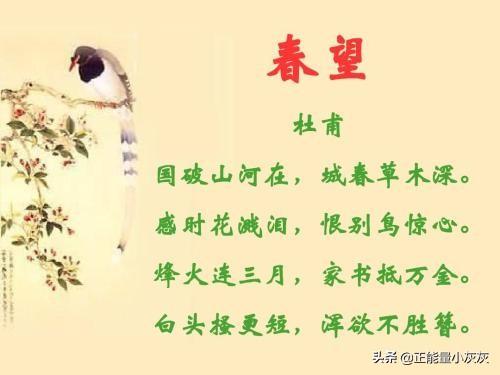 1、《春望》唐·杜甫国破山河在,城春草木深。感时花溅泪,恨别鸟惊心。烽火连三月,家书抵万金。白头搔更短,浑欲不胜簪。