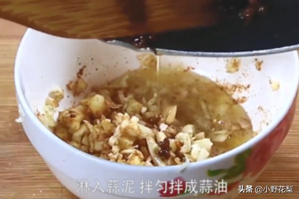 2、将花椒油淋入蒜泥均匀拌成蒜油。