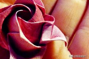 6、侧面看,4边都收紧,可以收成弹头形!一松手就弹开了,变得像小伞。掀开小嘴巴,向上翻折,沿着上个步骤的绿线折叠,就可以变成这样,完成一朵玫瑰花。