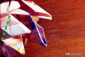 3、沿着绿线捏出突起的折痕!注意转折的位置。四边都捏好之后,整张钱就变得立体了,有了生动的螺旋外形。沿着绿线的位置,捏出一个呈直角的L形折痕。钱的角那里,要展平如图。