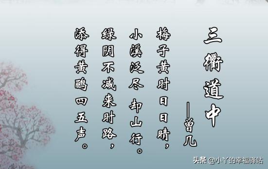 三衢道中(宋)曾几 梅子黄时日日睛,小溪泛尽却山行。 绿阴不减来时路,添得黄鹂四五声。 背景:曾几(1084——1166)宋朝诗人,字吉甫,号茶山居士,赣州(今江西赣州市)人,是一位旅游爱好者。这首诗是他游浙江衢州三衢山时写的。 诗意: 梅子黄的五月,正是江南的雨季,却遇上天天晴朗的日子。坐着小船游到了小溪的尽头,回程正好走山路,现在看到的是一路绿荫浓浓并不比以前看到的少,而绿荫深处传来的黄鹂的声声啼鸣,更增添了不少游兴。