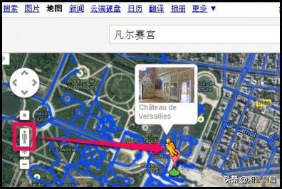3、接着,在搜索的结果中拖动左侧的小黄人到地图中的凡尔赛宫处,再点击弹出来的缩略图。