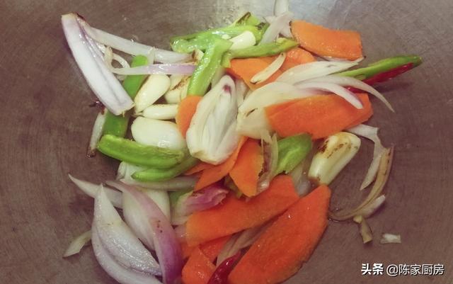 4.重新起锅烧热,加入25g油,到5成热,倒入切好的洋葱片、青椒片、胡萝卜片、蒜头,大火爆炒出浓郁香味。