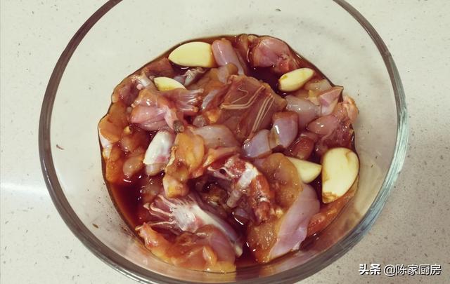 2.牛蛙去腥时,首先用凉水浸泡一小时,滤出血水;其次剪掉指甲,剁成小块,更好入味;最后加料酒、老抽、蒜子,腌制20分钟。