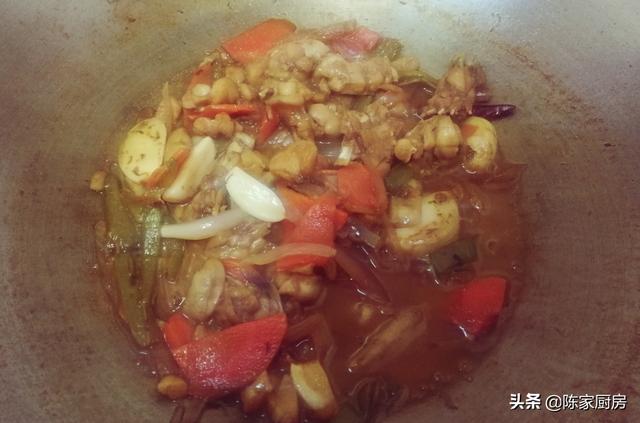6.倒入适量沸水,适量老抽,小火慢慢炖,不要盖锅,以免水蒸气滴入汤汁。炖上10分钟,让所有香味都入到蛙肉当中。