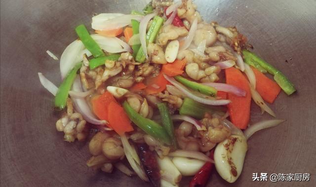 5.倒入“断生”后的牛蛙,继续翻炒几下,让食材间香味互相碰撞,然后要迅速改小火,以免粘锅。