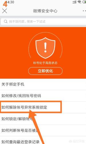 4、然后进入到微博安全中心内,点击打开如何解除帐号异常系统锁定。