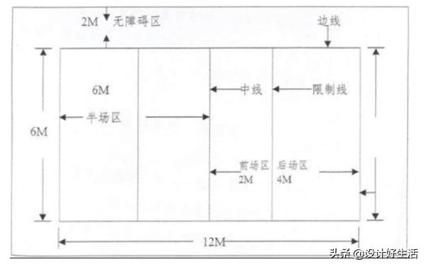 1、面积比赛区为6米(端线)×12米(边线)。其四周至少有2米宽的无障碍区。比赛场区的无障碍空间以地面量起至少高7米,气空间不得有任何障碍物。