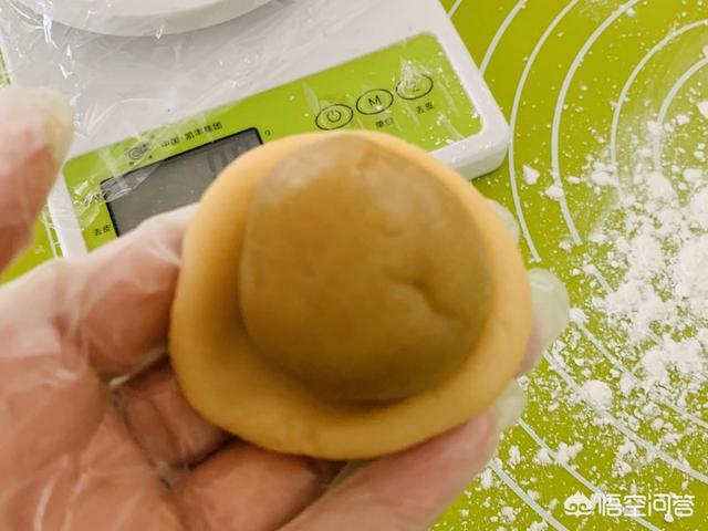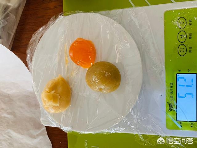 9、皮,白莲蓉,咸蛋黄共50克做一个月饼。