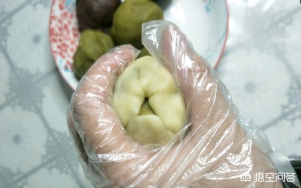 6、取一个小面团按扁,包入绿豆沙馅。