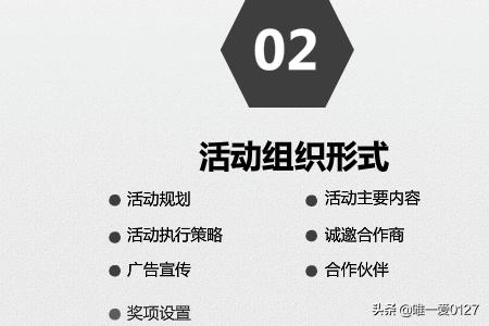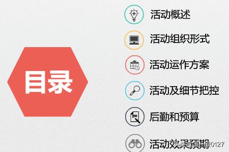 1,一篇好的活动方案策划书,一般包含六个方面:活动概述、形式、运作、细节、预算和效果,接下来跟大家详细介绍,如图所示