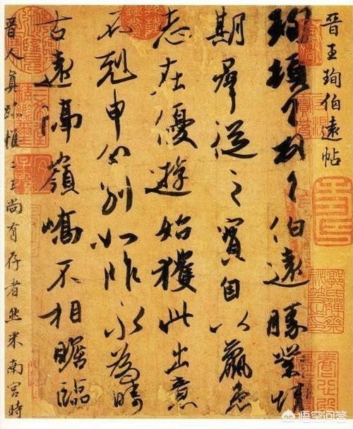 如把上面《伯远帖》中的书法与存世唐摹王羲之的书法相比较,从中可寻觅到王羲之书法的一些气息。此帖中的“从”“获”“别”等字用笔没有起笔收笔,也无牵丝引带,与存世唐摹王羲之早期书法《姨母帖》中的“遘”“摧”“剥”等字相比较,就有数笔较为接近。《伯远帖》中的“永”字,与王羲之《兰亭序》中的“永”字相类比,也写得更为潇洒。 现代书画家启功:“王帖惟余伯远真,非摹是写最精神。临窗映日分明见,转折毫芒墨若新。