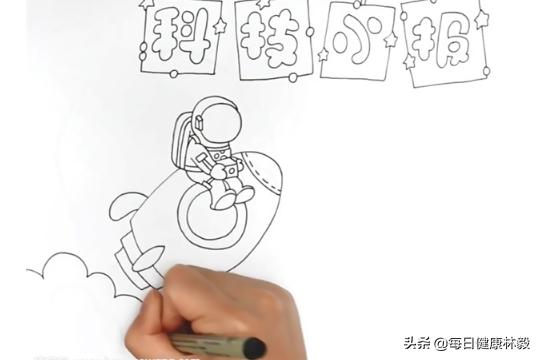 1、先写上“科技小报”几个字,用矩形边框框起来,再在下面画上一个火箭、云朵和宇航员。
