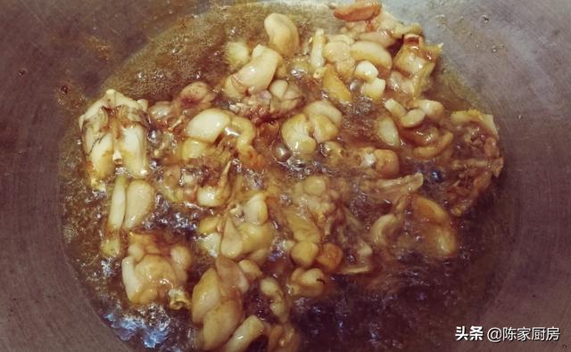 3.锅烧热,油加多一些,到五成热(150度)时,将牛蛙倒入锅内,快速炒至断生(表面颜色全部变了就叫断生)就要马上捞出来。