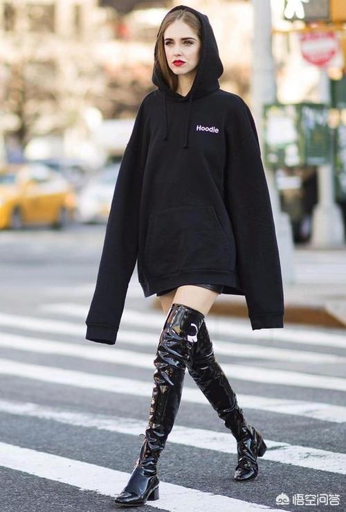 还有一种就是黑色卫衣搭配黑色皮裙,加长靴,这样的一身也非常时尚显高奥,非常简洁的一身装扮,却很有质感。