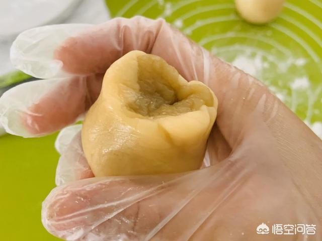 7、虎口推擀式包起,收口即可。注意月饼皮的均匀度。
