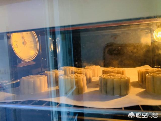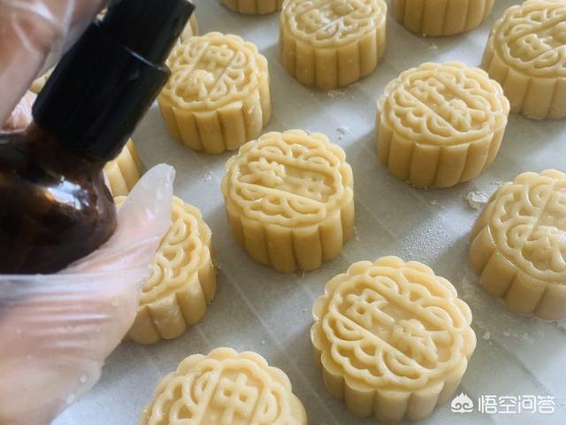 15、将月饼表面喷一点水,防止烤开裂,烤箱提前预热180℃。