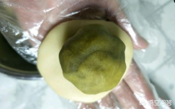 6、取一个小面团按扁,包入绿豆沙馅。