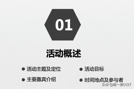 1,一篇好的活动方案策划书,一般包含六个方面:活动概述、形式、运作、细节、预算和效果,接下来跟大家详细介绍,如图所示
