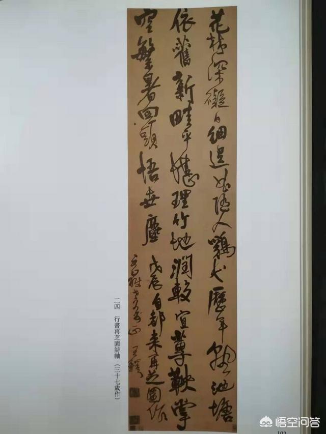 二 欣赏书法的奇正相间,错落有致之美,也就是书法章法要有安排变化才好看,我们玩挖坑红四斗地主,先出一个对子,那你手里必须有个更大的天板的对子在接应,要不就让对手给截胡了。书法一样,看下图王铎的《行书再芝园诗轴》。这是他三十七岁写得,第二行“依旧”起头四个字姑且说是”正“,到第五个平字,王铎就开始有章法安排,“平”字突然小了一大半,这都不算,接着出奇的变,“堪”字又突然放大了写,而且斜了,甚至快左边倾斜,像个人快滑倒左边了。这就是是出了个对字牌,既奇又险峻,在快倒之际,下面“理”字偏左错落有致的接应撑一下,力度不够,没事,再下面“竹地润较”几个字由小到大呈梯形椎体再呼应矫正一下。这一行字就稳稳地立住了,又回正了,可以说是有惊无险,妙趣横生。这就是大家风范。让人称奇。试想,如果这几个字平平正正的一溜写下去,是不是就死板,无趣味了?