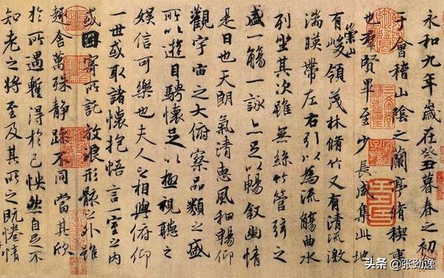 如把上面《伯远帖》中的书法与存世唐摹王羲之的书法相比较,从中可寻觅到王羲之书法的一些气息。此帖中的“从”“获”“别”等字用笔没有起笔收笔,也无牵丝引带,与存世唐摹王羲之早期书法《姨母帖》中的“遘”“摧”“剥”等字相比较,就有数笔较为接近。《伯远帖》中的“永”字,与王羲之《兰亭序》中的“永”字相类比,也写得更为潇洒。 现代书画家启功:“王帖惟余伯远真,非摹是写最精神。临窗映日分明见,转折毫芒墨若新。